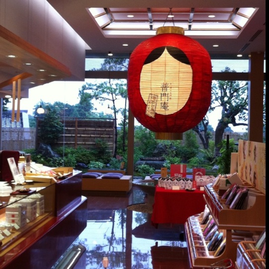 くぐって行くと、わらび餅の喫茶店とおかめマークのおかき屋さんが・・・